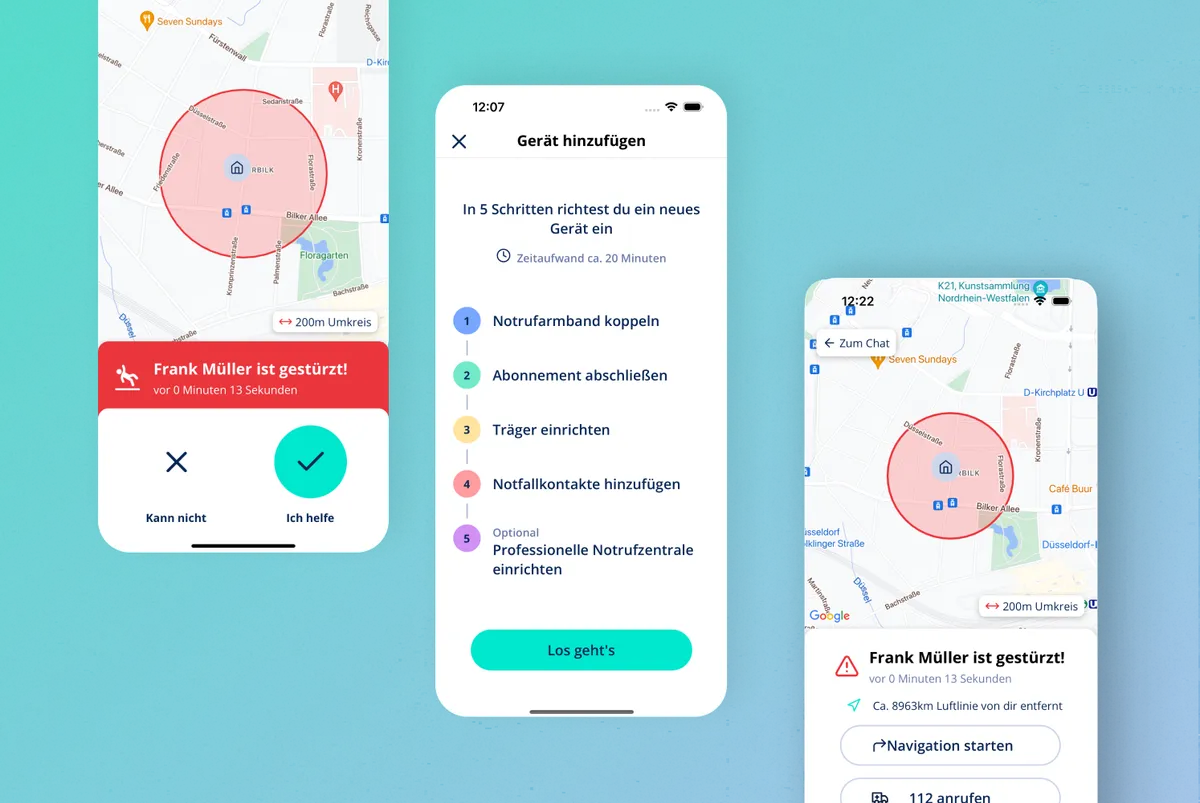 Das Armband ist der physische Auslöser, die App koordiniert den weiteren Ablauf. Beides muss nahtlos matchen, damit aus einem Knopfdruck Hilfe wird. - 🚨