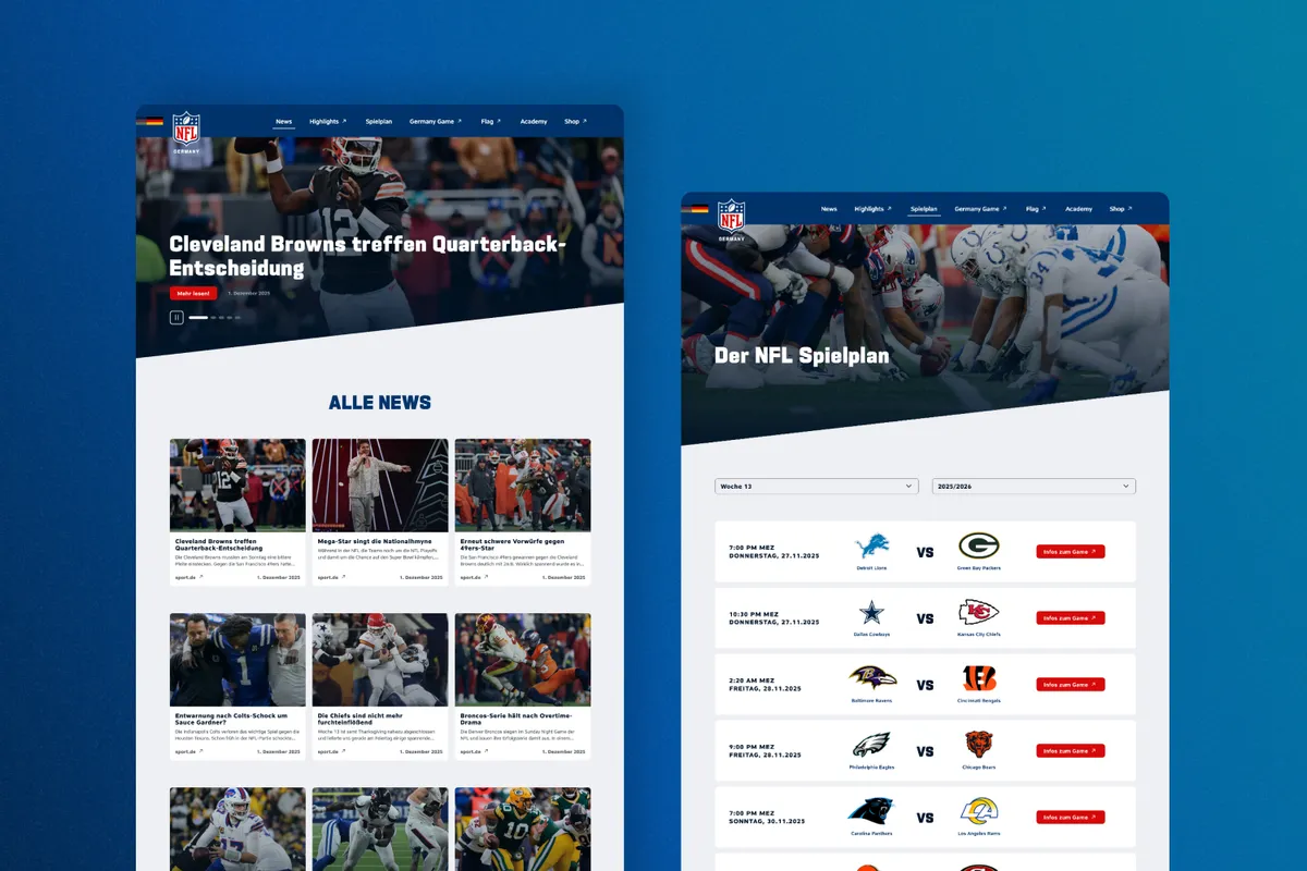 Gemeinsam mit NFL Deutschland haben wir eine digitale Heimat geschaffen, die Emotion trägt, Lastspitzen locker wegsteckt und Fans wirklich erreicht. Klar strukturiert. Technisch belastbar. Bereit für kommende Seasons.